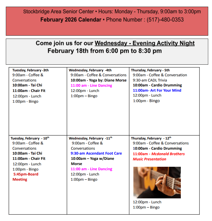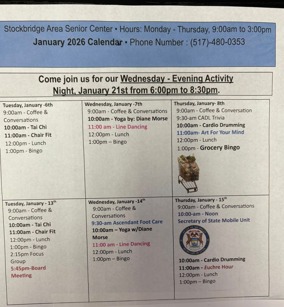 “…Promote, educate, and offer activities for the emotional well-being of the Stockbridge Area Senior Citizens and their families.”