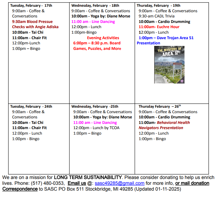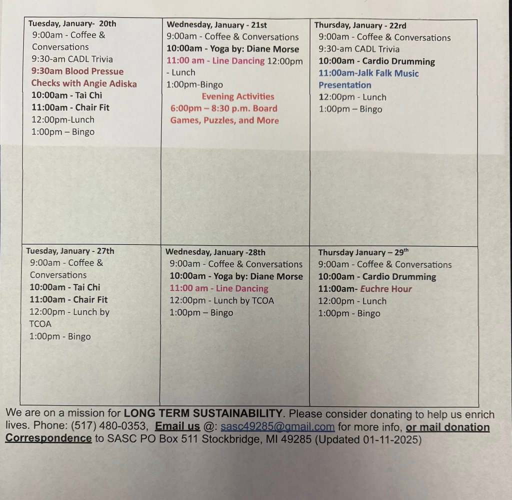 Playing a vital role in connecting seniors throughout a total of six townships in the southeastern corner of Ingham County, the SASC operates without a consistent funding source. It currently depends on community support to continue offering the programs and activities that enrich lives.