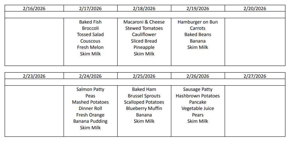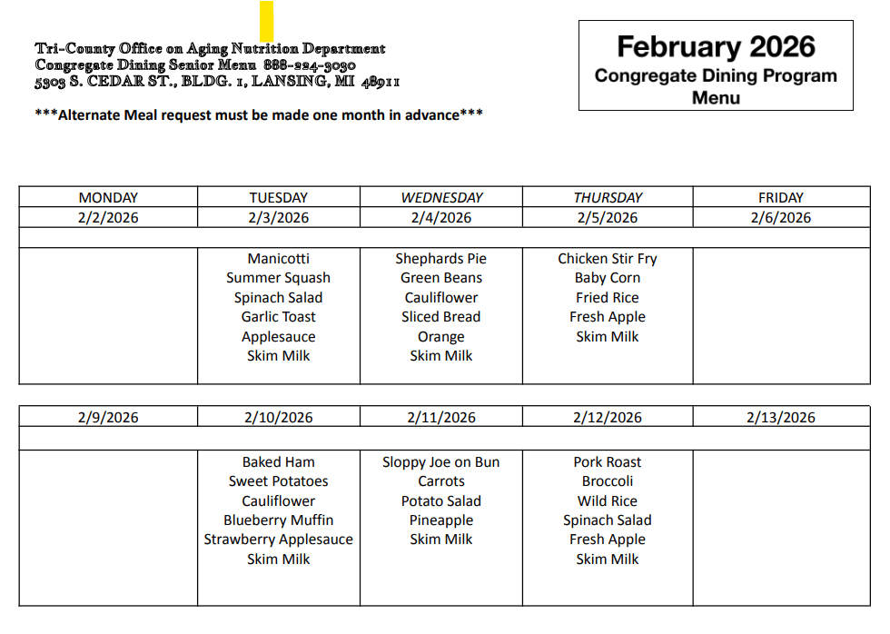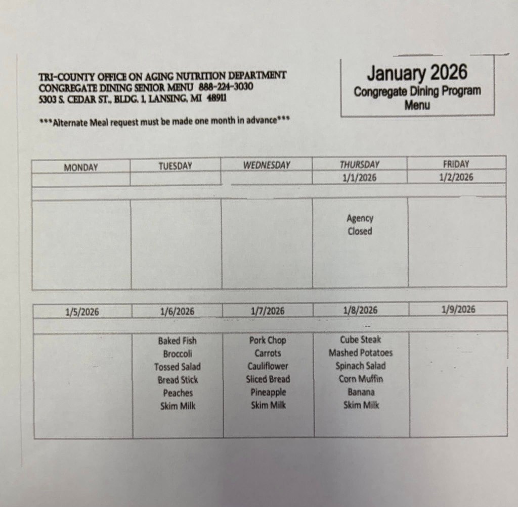 We offer an activity calendar with a variety of engaging opportunities. We believe in lifelong learning, keeping our bodies and minds active, and sharing fun and laughter often. The Tri-County Office on Aging helps us provide lunches. Please see below for the current and upcoming lunch menus.